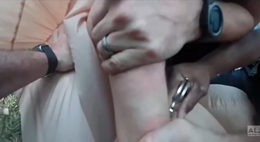 This law enforcement theatre of the absurd continues with Officer Babb’s attempts to stuff Ms. Gamble, still handcuffed, and her costume, still inflated, into the back of a patrol vehicle, as she cries out in pain. When the officers finally decide to remove her costume, they ask her name. “Aunt Tifa,” she responds. As the officer strips her costume and loads her into his patrol car, Officer Babb responds with typical Southern politeness: