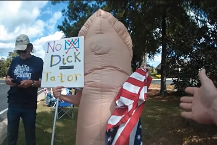 Inflatable costumes have become a a symbol of resistance to the POTUS 47 administration in this last little while, with frogs, roosters, unicorns and dinosaurs being repurposed from children’s birthday parties to add whimsy to the protest front lines. Last October, a No Kings protester in Fairhope, Alabama, opted for an inflatable costume more appropriate for a bachelor party or other sort of fertility rite; she showed up in a penis costume that she bought at a local Halloween store. So that the point wouldn’t be missed she accompanied her costume with a sign: